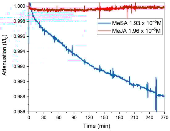 Normalized optical attenuation vs. time overlapping, acquired along MeSA (blue line) and MeJA (red line) vapor formation at RT introduced in the 4 L chamber 10 and 18 μL, respectively.