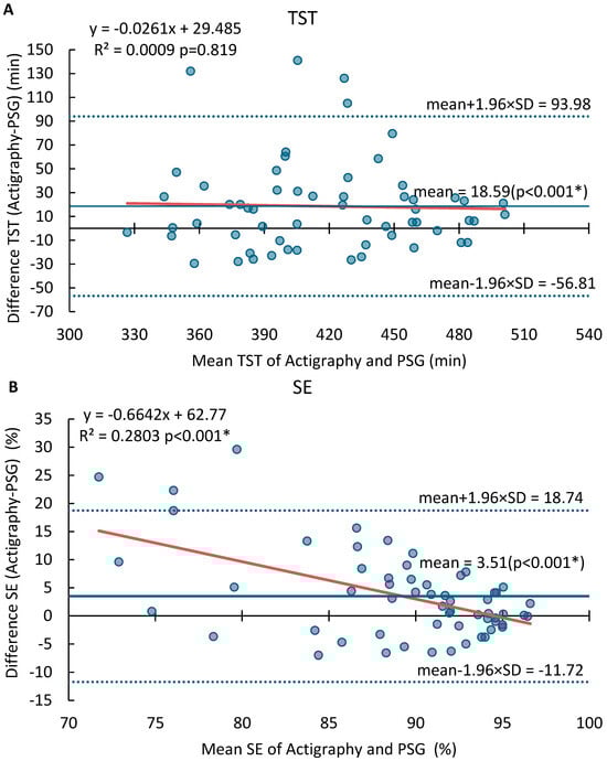 Bland–Altman plots were used to assess the agreements between MotionWatch8 and PSG for the sleep outcome variables of total sleep time (TST), sleep efficiency (SE), sleep onset latency (SOL) and wake after sleep onset (WASO). Each night’s data was treated as an independent observation in the analysis, meaning that data from different nights for the same participant were analysed separately, rather than averaged or combined. In the Bland–Altman plots, each data point represents the sleep parameters recorded for a single night, regardless of whether the nights belonged to the same or different participants. The differences for each sleep variable (displayed on the y-axis) were calculated as actigraphy outcome minus PSG outcome, and the mean of the two measures was displayed on the x-axis. The limits of agreements (LOA) were calculated as the mean difference ±1.96 × standard deviation, which indicated the range of values expected for 95% of individuals. To further evaluate the systematic bias and potential dependency of measurement differences on the size of the measurement, statistical significance tests were performed using SPSS. A one-sample t-test was used to examine whether the mean difference (offset) for each sleep variable significantly deviated from zero. Linear regression analyses were conducted to assess whether the differences (dependent variable) were significantly associated with the mean values (independent variable). The regression slope was tested for significance to determine if the measurement bias varied across the range of measurement values.