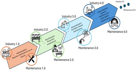 In Industry 4.0, sustainability has reshaped smart manufacturing, giving rise to Maintenance 4.0 [17] (also called Smart Maintenance), evolving from the reactive Maintenance 1.0 to the predictive and perceptive Maintenance 4.0 [18]. Maintenance 1.0 relied on operators fixing simple machinery faults as they occurred. Industry 2.0 introduced more complex machinery, necessitating dedicated maintenance departments for preventive care and inspections. The advent of automation has precipitated a concomitant shift in maintenance strategies, with the implementation of condition-based maintenance (or Maintenance 3.0), becoming the dominant paradigm. In this novel paradigm, maintenance models are constructed on the basis of collected and analyzed data, with the subsequent generation of recommended maintenance actions, predicated based on the specifics of the situation. Finally, with the advent of Industry 4.0, the use of IoT devices and sensors and the prominence of sustainability concepts evolved into the Maintenance 4.0 paradigm, in which maintenance becomes an enabler for the smart factory [19], by predicting future failures and prescribing efficient preventive actions. As Industry 5.0 emerges, maintenance must align with its core principles, progressing toward Maintenance 5.0. The progression of maintenance paradigms as the industry advances is illustrated in Figure 1.