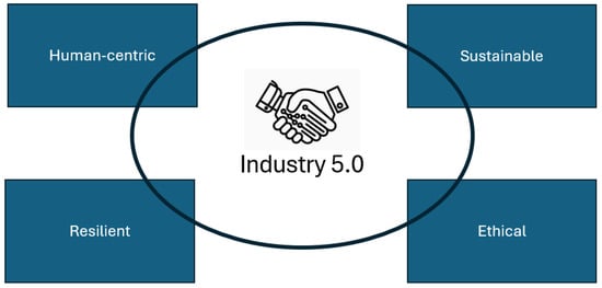 The transition to the new Industry 5.0 paradigm has defined modern organizations, demonstrating a shift and increase in focus, towards ethical engineering principles [20]. It has introduced new views of sustainability, such as social, which focus on the well-being of operators. Therefore, the use of smart machines equipped with sensors is becoming essential for the construction of automated tools capable of reducing the pressure on operators in managing emergency situations such as extraordinary maintenance. All maintenance efforts in this paradigm are guided by the four values of Industry 5.0, as illustrated in Figure 2.