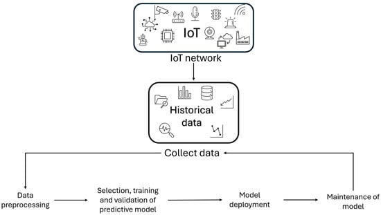The implementation of an IoT network that has been customized for industrial processes is a prerequisite for the subsequent application of ML or DL techniques to sensor data to formulate a predictive maintenance strategy. This process is characterized by four distinct stages [23], as illustrated in Figure 3. The first stage consists of the selection of historical data, collected through sensors. Subsequently, the selected data must be pre-processed, in order to transform them into an appropriate form for the next stage, in which a predictive model is constructed to recognize future failures. Finally, there is the maintenance stage of the model, in order to maintain the performance of the model over the long term, and the acquisition of new data.