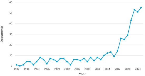 Number of documents published per year in Scopus (1986–2024) based on the following query: (TITLE-ABS-KEY (audio OR sound OR “acoustic emissions” OR microphone) AND (“machine learning” OR “deep learning” OR “artificial intelligence” OR “neural network”) AND (machining)).