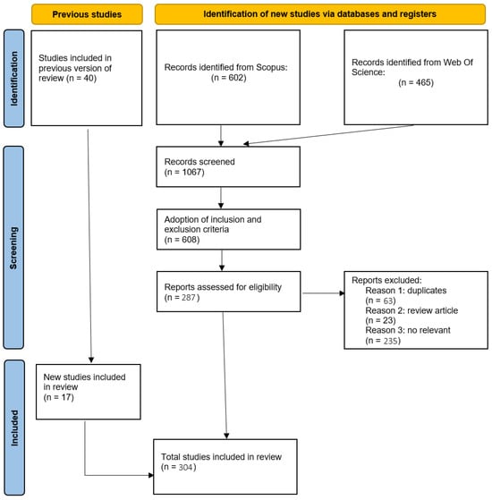 In the last phase of inclusion of studies, the missing publications not identified by the search query were manually included. In this review, other relevant research works on the field addressed were included. The identification of omitted papers was based on a previous review by the author of this work [27]. In particular, 17 other papers were incorporated, thereby yielding a total of 304 papers.