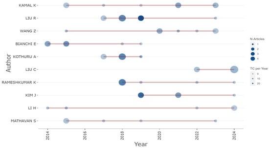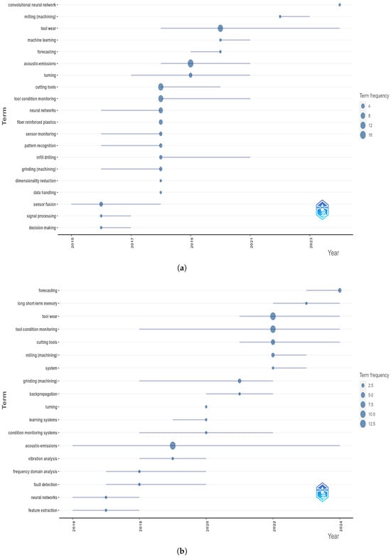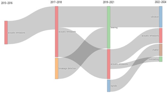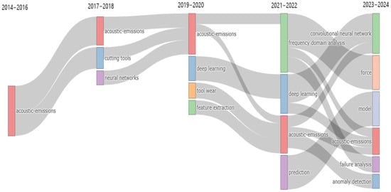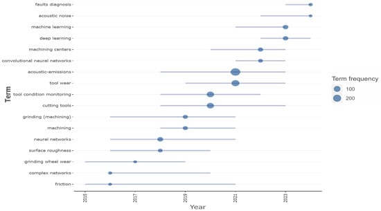 High-contributing authors are depicted in Figure 9. An analysis of production data over time reveals that the majority of production occurred during the period from 2018 onward (See Figure 10), in accordance with peaks depicted in Figure 8. These authors are strongly interested in the field of tool condition monitoring and the influence of tool wear on production efficiency. Indeed, as Figure 11 shows, a transition towards tool condition monitoring topics emerged during the period between 2018 and 2022.