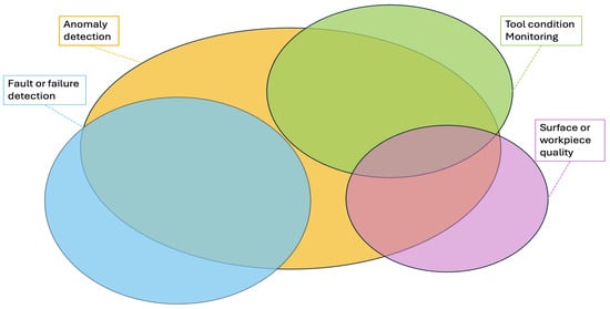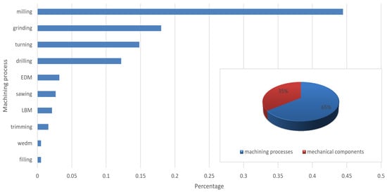 The findings demonstrated a high level of scientific interest in the utilization of audio signals in domains such as anomaly detection and TCM for machining operations. The construction of predictive models aimed to achieve objectives including enhanced process efficiency, reduced waste, minimized machine downtime, and, consequently, enhanced sustainability. As shown in Figure 12, 65% of the studies addressed various machining processes, whereas 35% focused specifically on individual components of industrial machinery, such as pumps and gearboxes, with the milling process being the most analyzed, followed by the grinding process.
