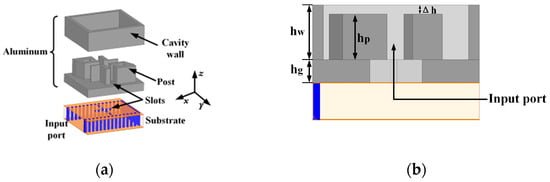 Figure 1 shows the geometry of the designed SIW-fed CP ME-dipole antenna element. This antenna element consists of a metallic radiating part and a bottom layer of dielectric substrate, where the substrate is Rogers 5880 (εr = 2.2, tanδ = 0.0009, Rogers Corporation, Chandler, AZ, USA) with a thickness of 1.575 mm. The proposed antenna is fed by a cross-shaped SIW slot. For the metallic radiating part, the surfaces of two pairs of metal posts form two pairs of electric dipoles. The metal posts are supported by a 1 mm ground plane, and the metal posts forming each pair of electric dipoles are located on either side of the SIW slot. A metal cavity is loaded around the four metal posts. The equivalent magnetic dipole is realized by the gap between the metal posts and the wall as well as the gap between the metal posts. The proposed ME-dipole is fed by a cross-shaped SIW slot which consists of a short slot and a long slot. Through the cross-shaped slot, the 3 dB AR bandwidth can be expanded. The optimized values of the final design parameters of the antenna element are tabulated in Table 1.