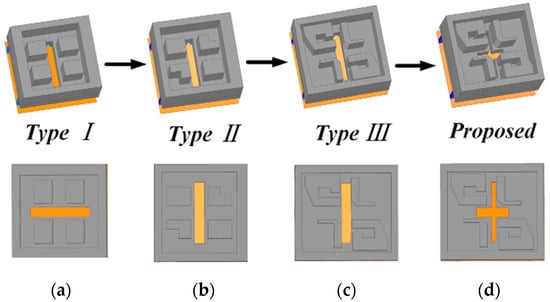 Design process of the proposed CP ME-dipole antenna element. (a) Type I: traditional LP ME-dipole. (b) Type II: introduce a suitable perturbation (c) Type III: introduce ring-shaped metal posts. (d) Proposed CP antenna element.