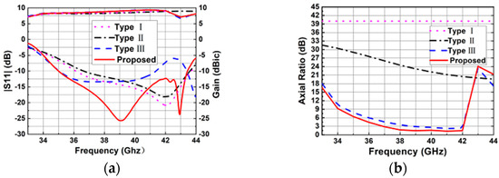Performance comparisons of the three types of antenna elements. (a) Simulated |S11| and gains. (b) Simulated ARs.