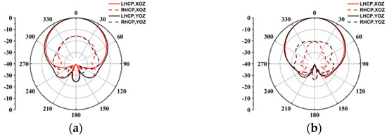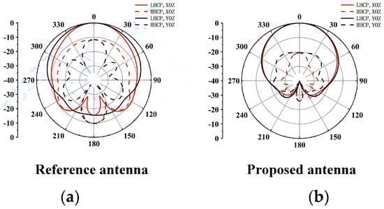Comparisons of the simulated radiation patterns at 41 GHz. (a) the reference antenna element, (b) the proposed CP antenna element.
