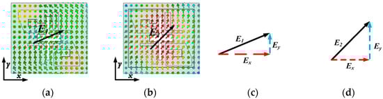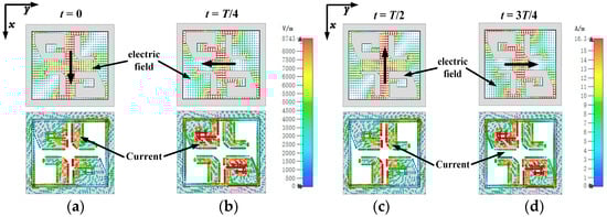 To better explain the operating mechanism of the circular polarization, the electric field distributions at four states (t = 0, T/4, T/2, 3T/4, where T is a time period) are shown in Figure 5. The black arrow represents the direction of the E-field vector at the corresponding time period, which, over a time period rotates in a clockwise manner, so a left-hand CP (LHCP) wave can be generated. As shown in Figure 5a, at the time t = 0, the fields between the metal posts arranged along the y-axis and the metal posts’ surface current are minimized. At t = T/4, the fields on the gap between the metal posts and the cavity walls and metal posts’ surface current dominate, as illustrated in Figure 5b. So, the electric dipole mode and magnetic dipole mode are excited at time t = T/4. As shown in Figure 5d, at time t = 3T/4, the electric dipole and magnetic dipole are excited again with opposite field direction compared to the mode at t = T/4. Therefore, it can be concluded that the ME-dipole mode is excited.