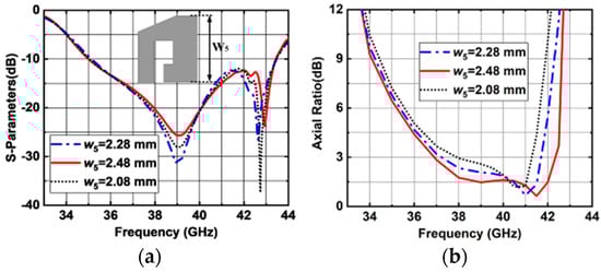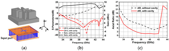 The design processes of the proposed CP ME-dipole antenna element are shown in Figure 2. In Figure 2a, a traditional LP ME-dipole antenna is designed. It consists of two pairs of metal posts, a metal cavity and corresponding SIW feeding structures. In order to enhance the perturbation, the posts have been modified as shown in Figure 2b. To further enhance the 3 dB AR bandwidth, the four metal posts are divided into two groups which are symmetrical in the center. One group of posts is cut into an L shape, while the other group of posts is cut into a ring shape as shown in Figure 2c. Its simulated 3 dB AR bandwidth is 7.9% from 38.8 to 42.0 GHz as shown in Figure 3b. In the final proposed design, the rectangular coupling slot is modified as a cross-shaped slot with two different lengths and widths which yields a 13.2% 3 dB AR bandwidth from 36.9 to 42.1 GHz. As shown in Figure 3a, it can be seen that the impedance matching has been significantly improved by introducing the cross-shaped coupling slot.