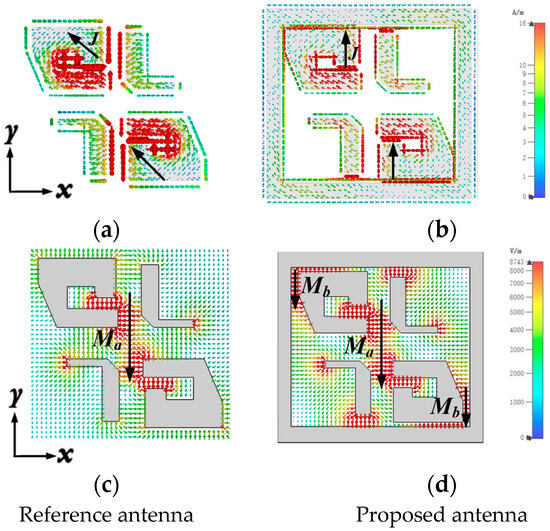 Simulated E-field distributions with the same phase at 38 GHz. (a) E-field distribution of the reference antenna. (b) E-field distribution of the proposed antenna. (c) Qualitative analysis of the E-field relationship of the reference antenna. (d) Qualitative analysis of the E-field relationship of the proposed antenna.