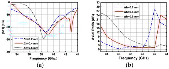 Simulated results of the proposed antenna element with different Δh values. (a) |S11|. (b) ARs.