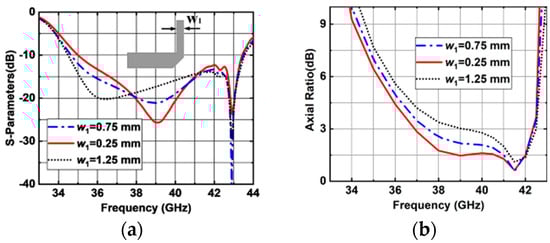 Figure 11 shows the simulated results with different lengths of L-shaped metal posts (w1). The lower resonant frequency point shifts to a lower band as w1 increases, while the higher resonant frequency point remains virtually unchanged. However, the 3 dB AR bandwidth at the lower band decreases. The final value of w1 is optimized to 0.25 mm.
