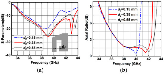 The simulated |S11| and AR versus w5 are shown in Figure 12. When w5 varies, the impedance matching is slightly affected as shown in Figure 12a. The simulated results show that when w5 decreases, the AR performance deteriorates, as shown in Figure 12b. So, the optimized value of w5 is selected to be 2.48 mm. The simulated results show that upper and lower band AR could be optimized by the size of L-shaped and ring-shaped metal posts. It can be seen in Figure 13 that both the impedance matching, and AR performances are affected by the opening length of ring-shaped metal post (d2). As d2 increases from 0.15 to 0.55 mm, a wider 3 dB AR bandwidth can be achieved. However, the impedance matching deteriorates. Finally, the optimized value of d2 is selected to be 0.35 mm.