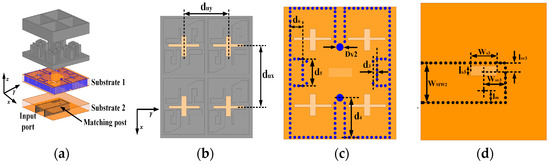 Geometry of the proposed 2 × 2 antenna subarray. (a) 3D exploded view. (b) Top view. (c) Substrate 1. (d) Substrate 2.