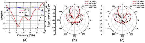 Simulated results of the 2 × 2 CP ME-dipole antenna subarray. (a) |S11|, gain, and AR. (b) Radiation pattern at 36 GHz. (c) Radiation pattern at 40 GHz.