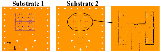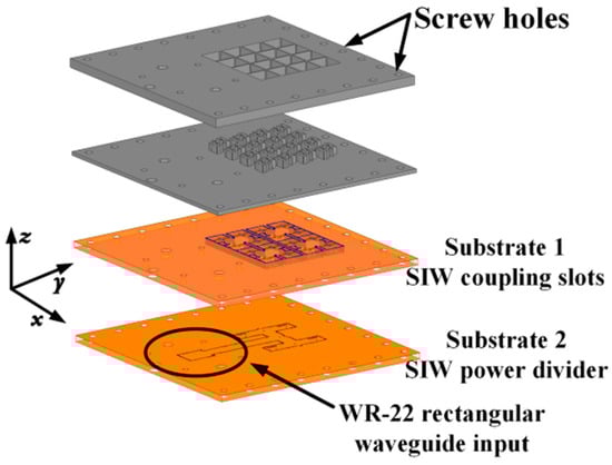 Based on the 2 × 2 CP antenna subarray described above, a 4 × 4 antenna array was designed, with its geometry shown in Figure 16. The feeding network of the 4 × 4 antenna array is shown in Figure 17. The entire antenna array is arranged vertically. Substrate 2 contains a one-to-four SIW power divider and a standard WR-22 rectangular waveguide to SIW transition.