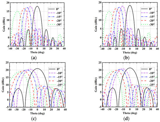 In order to prove the beam scanning capability of the proposed antenna array, simulated results of 1 × 8 array and 4 × 4 array are given below. The beam scanning simulated performance of the 1 × 8 array at 38 and 41 GHz are shown in Figure 18a,b. At 38 and 41 GHz, the scan losses of 1 × 8 array are lower than 3.02 and 3.44 dBic, respectively. The 1 × 8 array can scan up to ±30°. The beam scanning simulated performance of the 4 × 4 array at 38 and 41 GHz are shown in Figure 18c,d. At 38 and 41 GHz, the scan losses of 4 × 4 array are lower than 2.33 and 2.39 dBic, respectively. The 4 × 4 array can scan up to ±25°. This proves that the proposed antenna array in this paper has relatively good beam scanning ability.