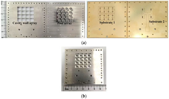 Fabricated 4 × 4 CP antenna array. (a) Disassembled drawing. (b) Assembly drawing of the prototype.