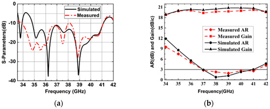 The proposed 4 × 4 antenna array was fabricated using standard single-layer PCB technology, as shown in Figure 19. The screw holes were designed for assembly. The influences of the metal screws on the radiation performance of the array were included in the simulation. The overall dimensions of the antenna were 60.2 mm × 65.2 mm× 6.7 mm. Figure 20 shows the simulation and measurement results of this proposed 4 × 4 antenna array. It can be seen that the simulated and measured impedance matching the bandwidths of this antenna array are 16.8% (34.8–41.2 GHz) and 19.2% (33.9–41.1 GHz), respectively. The simulated and measured 3 db AR bandwidths are 10.3% (36.9–40.9 GHz) and 10.3% (37–41 GHz), respectively. The measured peak gain is 20.3 dBic at 41 GHz.