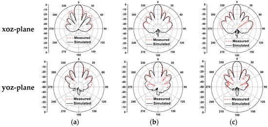 The simulated impedance bandwidth (|S11| ≤ −10 dB) of the proposed element is 21.4% from 35.0 to 43.4 GHz, while the simulated 3 dB AR bandwidth is 13.2% from 36.9 to 42.1 GHz. The simulated peak gain is 9.21 dBic at 40.5 GHz. The simulated results of the ME-dipole antenna element radiation patterns at 37 and 40 GHz are shown in Figure 4. The antenna element has stable gain, and the radiation patterns of the E-plane (yoz plane) and H-plane (xoz plane) are virtually equal.