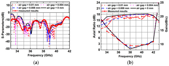 The measured radiation efficiency can be calculated by comparing the simulated directivity and measured gain. Then, the peak measured radiation efficiency of the 4 × 4 CP antenna array is 83.2% at 41 GHz. Figure 21 shows the simulated and measured radiation patterns of the 4 × 4 antenna array. It can be observed that the radiation patterns of the simulated and measured results are stable and consistent across the entire operating band. In the proposed CP antenna array, the aluminum plate and the two PCB substrates are fixed by screws; therefore, the effects of possible air gaps between substrate 1 and the aluminum plate should be considered. The simulated results of the 4 × 4 CP antenna array were considered. We took into account the possible air gaps between the PCB antenna array, with different air gap thicknesses are shown in Figure 22. Note that when the thickness of the air gaps reaches 0.008 and 0.01 mm, the impedance bandwidth deteriorates and the gains decrease at some frequencies, while the 3 db AR bandwidth remains largely unchanged. Also, the effect of the air gaps can be ignored when the thickness is 0.004 mm. This indicates that the possible air gaps can affect the performance of the assembled antenna array.