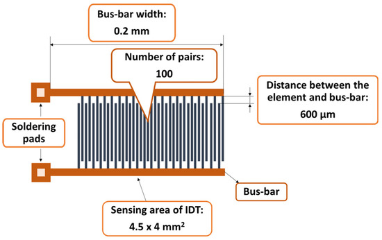 The synthesis of the sensitive film based on the CNOs–PVA nanocomposite at a 1/1 mass ratio started with preparing the PVA solution. The hydrophilic polymer solution was prepared by gradually dissolving 6 mg of PVA in 12 mL of deionized water for 6 h at 90 °C in an ultrasonic bath (FS20D Fisher Scientific, Schwerte, Germany), working at 42 kHz (70 W output power). CNOs (6 mg) were dispersed in a clear water-based PVA solution and subjected to intensive stirring in an ultrasonic bath for 6 h, maintaining the temperature at 50–60 °C. The dispersion was drop-cast over a metallic interdigitated (IDT) structure while the contact area was masked [60]. The IDT dual-comb structure was manufactured on a Si substrate (470 µm thickness), covered by a SiO2 layer (1 µm thickness) (Figure 2). The sensing film was heated at 70 °C for 2 h in vacuum, and, finally, the whole RH sensing device was dried at 70 °C for 2 h [61]. The synthesis of the sensitive film based on the CNOs–PVA nanocomposite at a 2/1 mass ratio was performed similarly, except for the CNO/PVA mass ratio.