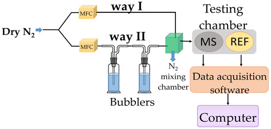 Before starting the experiments, the devices were exposed to dry nitrogen for 6 h to achieve an almost moisture-free environment. MS and REF were positioned near the gas inlet to be subject to quasi-identical testing environments. Current variations were induced using a Keithley 6620 current source. The output voltage was recorded, and the electrical resistance was computed with a PicoLog data logger. The total electrical power consumption of MS was less than 2 mW, its low power consumption being a significant advantage of this type of sensor.