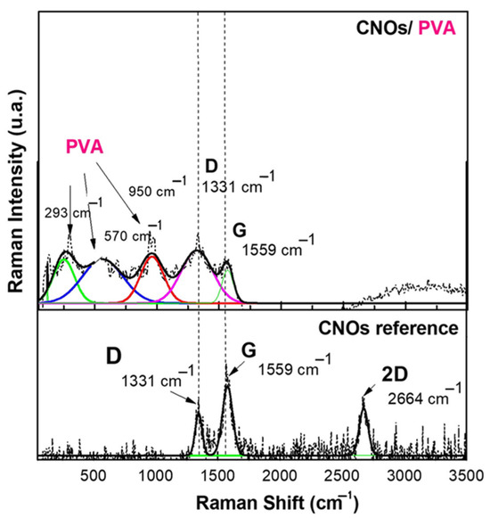 These patterns agree with other studies on the microstructure of CNO-based composites [25]. For CNOs–PVA nanocomposite deposited on a Si substrate, only a low-intensity band is observed, which is correlated with the semi-crystalline nature of pure PVA [67].