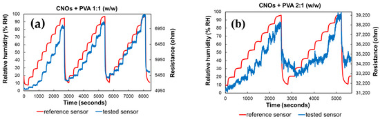 RH and resistance variation vs. time for two types of CNOs–PVA sensing layers: (a) 1:1 (w/w), and (b) 2:1 (w/w).