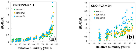 Relative variation in the resistance (Rf − Ri)/Ri as a function of RH for MS employing as sensing layer: (a) CNOs–PVA at 1:1 (w/w), and (b) CNOs–PVA at 1:1 (w/w) (sorption—red dots, desorption—blue dots).