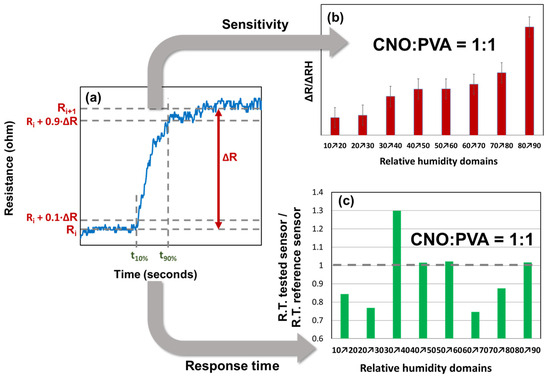 The response time and sensitivity analysis were conducted only for the sensor with the CNOs–PVA at 1:1 (w/w) sensing layer, as presented in Figure 11.