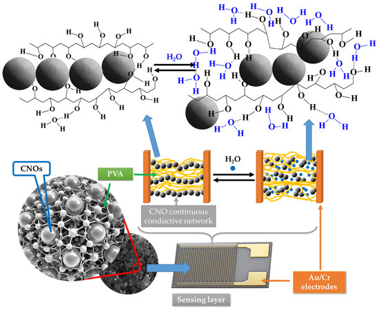 The first RH detection mechanism relies on CNOs being p-type semiconductors [68]. Once the contact between CNOs and water molecules occurs, the latter donate their electron pair, thus decreasing the concentration of holes in the CNOs structure. As the RH level increases, the hole concentration in CNOs decreases; hence, the CNOs–PVA nanocomposites become less conductive.