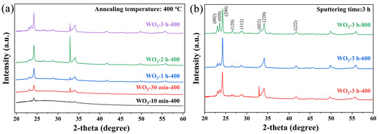 (a) XRD patterns of WO3 thin films annealed at 400 °C with different sputtering times, (b) XRD patterns of WO3 thin films deposited with a sputtering time of 3 h and annealed at different temperatures.