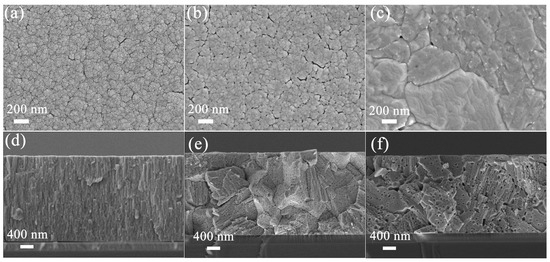 SEM images of WO3 thin film with a sputtering time of 3 h at different annealing temperatures: (a) 400 °C; (b) 600 °C; (c) 800 °C. (d–f) Cross-sectional SEM images of WO3 thin film annealed at 400–800 °C, respectively.