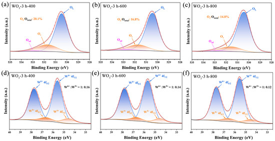 The chemical states and surface compositions of WO3-3 h-400, WO3-3 h-600, and WO3-3 h-800 prepared with different annealing temperatures were further analyzed using XPS analysis. As shown in Figure 4a–c, the O 1s spectra of the samples could be deconvoluted into three characteristic peaks at ~530.4, ~531.7, and ~532.7 eV, which corresponded to lattice oxygen (OL), oxygen vacancy (OV), and adsorbed oxygen (Oad), respectively [29]. In the W 4f spectra (Figure 4d–f), two distinctive characteristic peaks of the WO3 films were observed at ~34.5 and ~36.6 eV, and they were attributed to the W 4f7/2 and W 4f5/2 orbitals of W6+, respectively. Conversely, the other two smaller peaks were located at ~35.6 and ~37.7 eV corresponding to the W 4f7/2 and W 4f5/2 orbitals of W5+, respectively [30].
