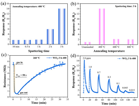 (a) Response values of WO3 thin films with different sputtering times to 2.0 ppm 2-CEES at 260 °C. (b) Response values of WO3-based sensors annealed at different temperatures to 2.0 ppm 2-CEES 260 °C. (c) Dynamic response–recovery curve of the WO3-3 h-400-based sensor to 1.0 ppm 2-CEES at 260 °C. (d) The dynamic response curve of the WO3-3 h-400-based sensor to 2-CEES in the concentration range of 0.015–2.0 ppm at 260 °C.