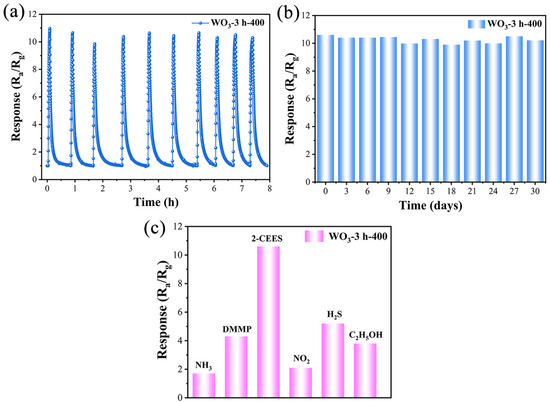 The repeatability, stability, and selectivity of the WO3-3 h-400-based sensor were further evaluated. Firstly, the response of the WO3-3 h-400-based sensor to 1.0 ppm 2-CEES was investigated over 10 consecutive cycles at 260 °C. The response values were consistently approximately 10.6, with a fluctuation of <2%, and the sensor exhibited excellent response–recovery characteristics, indicating that it displayed a good repeatability (Figure 6a). The results of a long-term stability study for 30 days under the same conditions revealed that the response value of the sensor did not change significantly over an extended time, and the stable detection performance could be maintained (Figure 6b). In addition, we investigated the selectivity of the WO3-3 h-400-based sensor for 2-CEES at 260 °C with interfering gases, including sarin simulants (DMMP) and other common volatile organic gases. The response value of the sensor to 1.0 ppm 2-CEES was more than twice as high as the values to other gases at identical concentrations (Figure 6c). In particular, the high selectivity of the sensor between 2-CEES and DMMP enables it to effectively discriminate between sulfur mustard and nerve agents, which is critical in detecting HD in practical applications. Above all, the WO3-3 h-400-based sensor shows its distinct ppb level sensing performance toward 2-CEES, which is comparable to, or even outperforms, most of the reported MOS-based 2-CEES gas sensors (Table S1).