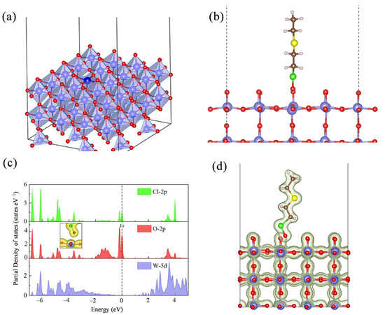 (a) Crystal structures of WO3, (b) models of the adsorbed 2-CEES on WO3, (c) partial density of states, and (d) charge densities of the 2-CEES on WO3. W (purple), O (red), Cl (green), C (brown), H (light pink), and S (yellow).