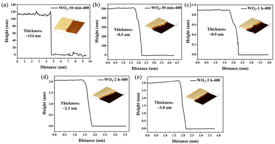 Amorphous WO3 was deposited directly on Si/SiO2 substrates via magnetron sputtering and then annealed in air to yield WO3 thin films. Powder XRD revealed that no clear diffraction peaks were observed in the patterns of the WO3-3 h-unannealed samples, indicating that the unannealed WO3 thin films were structurally amorphous (Figure S3). Conversely, the annealed WO3 thin films displayed good crystallinity, and their XRD patterns (Figure 2a) were consistent with standard monoclinic WO3, with three strong peaks at 24.4°, 32.9°, and 34.1° corresponding to the (200), (022), and (220) crystal planes, respectively [26]. As the sputtering time increased, the intensities of the diffraction peaks representing the (002) and (020) crystal planes were gradually enhanced, and the peak shapes sharpened, indicating that the grain size increased and the crystallinity improved [27]. When the sputtering time was kept constant, the crystallinity of the WO3 thin films varied significantly with different annealing temperatures (Figure 2b). The relatively broad peak shapes and several weak characteristic peaks in the pattern of WO3-3 h-400 indicated that the sample could still contain amorphous WO3 or smaller grains. As the annealing temperature increased to 600 and 800 °C, the diffraction peaks were clearly enhanced and sharpened, indicating that the grain size increased and the crystallinity of the film was enhanced [28]. Based on the Scherrer equation, the grain size of the WO3 film gradually increased as the annealing temperature increased, and the average grain sizes of WO3-3 h-400, WO3-3 h-600, and WO3-3 h-800 were 12.1, 16.6, and 19.9 nm, respectively.