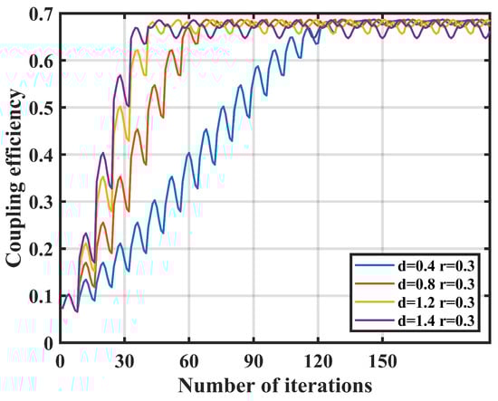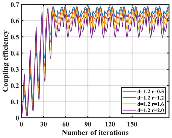 When the fixed nutation step length and the number of sampling points remain constant, after approximately 48 iterations, all data sets of data reach a steady state, with coupling efficiency above 0.5. Thus, varying the nutation radius has little impact on the coupling speed of the system.