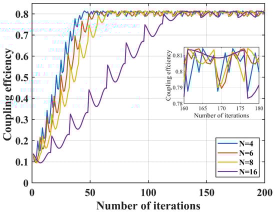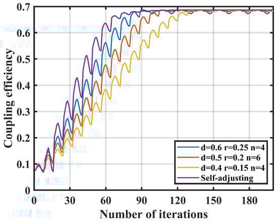 When = 4, the number of iterations required to reach a steady state is the smallest, but the rate of change in power is the largest in unit time, resulting in poorer coupling stability. Conversely, when = 16, the number of iterations required to reach steady state is the greatest, but the rate of change in power is minimal both during the coupling process and after reaching steady state. Therefore, when the nutation radius and the nutation step length remain constant, changing the number of sampling points n also affects the coupling speed and stability to some extent.