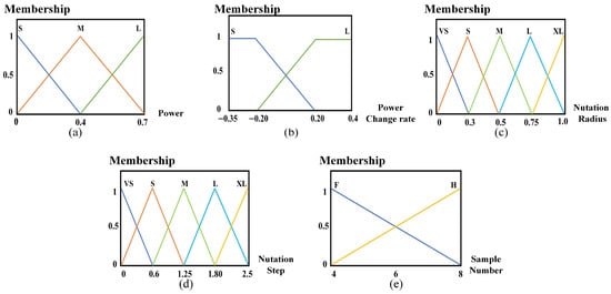 Then, the fuzzy domains of the above parameters are divided, respectively, to obtain the fuzzy sets for these five parameters, represented as follows: the fuzzy set of coupling power is , the fuzzy set of power change rate is , the fuzzy set of nutation radius and the fuzzy set of nutation step length are , and the fuzzy set of the number of sampling points is , where vs. denotes very small, denotes small, denotes medium, denotes large, denotes very large, denotes few, and denotes many.