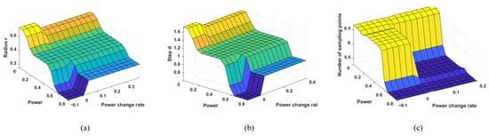 After analyzing the power change rate data under various operating conditions and referring to Equation (16), the fuzzy domain for the power change rate, denoted as , was determined to be in the range of [−0.35, 0.4]. Additionally, multiple combinations of nutation step length and nutation radius were selected for extensive simulations to evaluate the system’s performance under both static and dynamic conditions. In the static scenario, the rise time and steady-state accuracy were assessed, while in the dynamic scenario, the results under added disturbances were analyzed. Considering the trade-offs among rise time, steady-state accuracy, and disturbance resistance, the fuzzy domains for and were ultimately determined as (0, 2.5] and (0, 1.0], respectively.