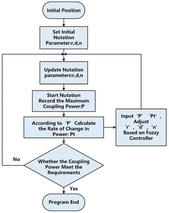 where represents the average coupling power of the current scanning cycle, and represents the average coupling power of the previous scanning cycle. This approach is compatible with the fuzzy control self-adjusting algorithm, which adjusts parameters based on the deviation and deviation change rate [,]. Consequently, the design parameters of the fuzzy controller include coupling power , power change rate , nutation radius , nutation step length , and the number of sampling points .