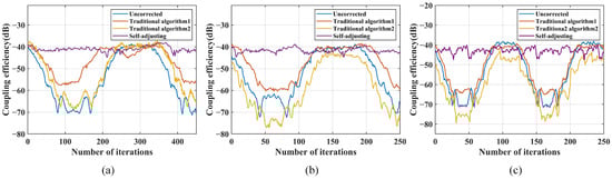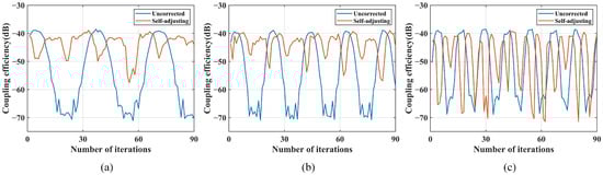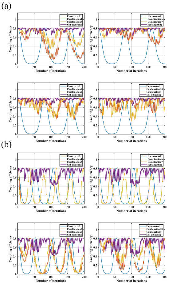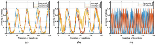 Three sets of traditional fiber nutation controllers and parameter self-adjusting controllers are selected for comparison. The comparison includes whether the iteration has reached the maximum coupling power position, the number of iterations, and the calculation of the average coupling efficiency () and the standard deviation () after steady-state. The results are presented in Table 3 and Figure 12.