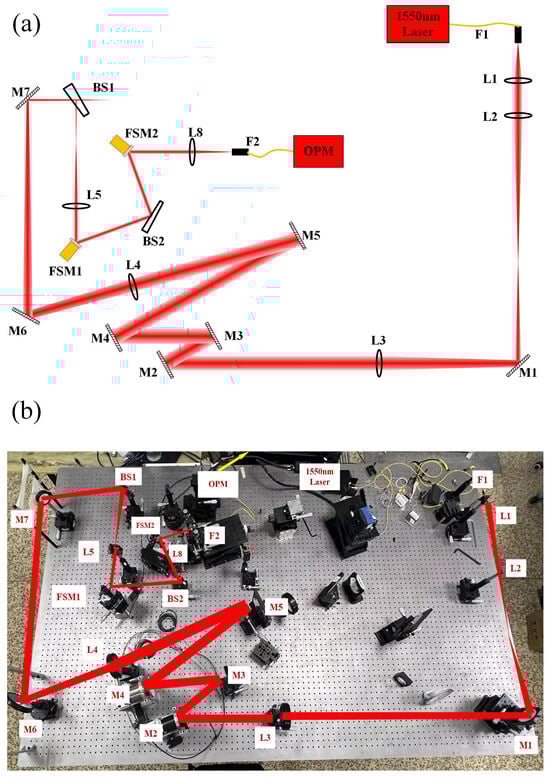 Ensuring efficient coupling of free-space optical beams into single-mode fiber (SMF) is a key challenge in high-performance FSOC systems [,]. In inter-satellite FSOC systems, due to the small core diameter of the SMF, the alignment precision of the beam is critically high, meaning that even the slightest errors, thermal effects, or mechanical disturbances can significantly reduce coupling efficiency. Furthermore, in satellite-to-ground FSOC systems, free-space optical beams are susceptible to atmospheric turbulence, which causes wavefront phase distortions, reducing transmission quality, increasing the bit error rate, and making the communication link unstable. To mitigate the wavefront distortions caused by atmospheric turbulence, adaptive optics (AO) technology has been widely applied. AO systems help to improve transmission quality by real-time detection and correction of wavefront aberrations. However, even after AO correction, factors such as temperature fluctuations and platform vibrations may still cause alignment misalignments, affecting coupling efficiency. Therefore, in both inter-satellite and satellite -to-ground FSOC systems, especially after AO systems correct for atmospheric turbulence, it is essential to introduce a fiber coupling system that can compensate for residual alignment errors, further improving fiber coupling efficiency.