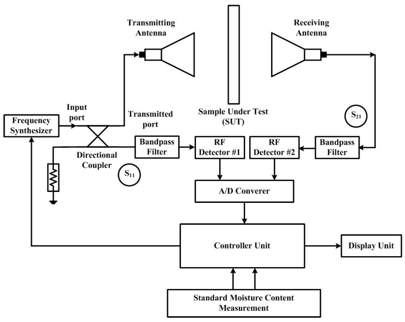 A microwave-based technique, particularly the free-space method, is an interesting approach since it allows for rapid and real-time measurements for a bulk of lumber. This method involves transmitting microwave signals through the air (frees pace) into the lumber, then analyzing the attenuation and phase shift of these signals due to the moisture content. It has been widely applied for the measurement of various bulk agricultural products, e.g., paddy, grains, wheat, and peanuts [