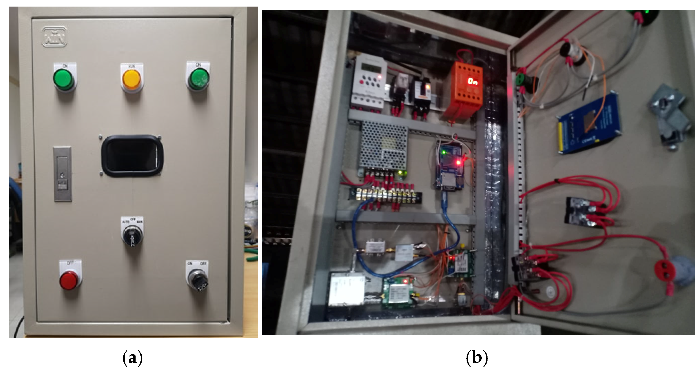 Figure 16. The microwave sensor system has two modes of operation: automatic mode and manual mode. A switch to select the operation mode and two status lights are on the front panel of the control cabinet. A switch on the lower right corner of the control cabinet is used to turn the system on; then, an orange status light is on. The automatic mode is set to measure the moisture content every hour, while the manual mode is a bypass function to simultaneously measure the moisture content. The moisture content status of the rubberwood in the dehydration process is displayed on the LCD screen on the front panel of the control cabinet. In addition, the measured data are backed up on a memory card and are wirelessly sent to be stored in the cloud.